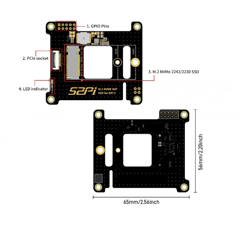 N05 is compatible with the standard HAT size of Raspberry Pi and supports two sizes of NVMe SSD: 2230 and 2242. The included SSD mounting screws make it convenient for users to switch between the two sizes at any time.
