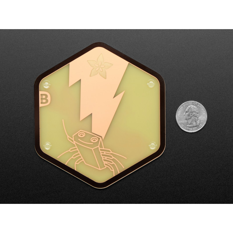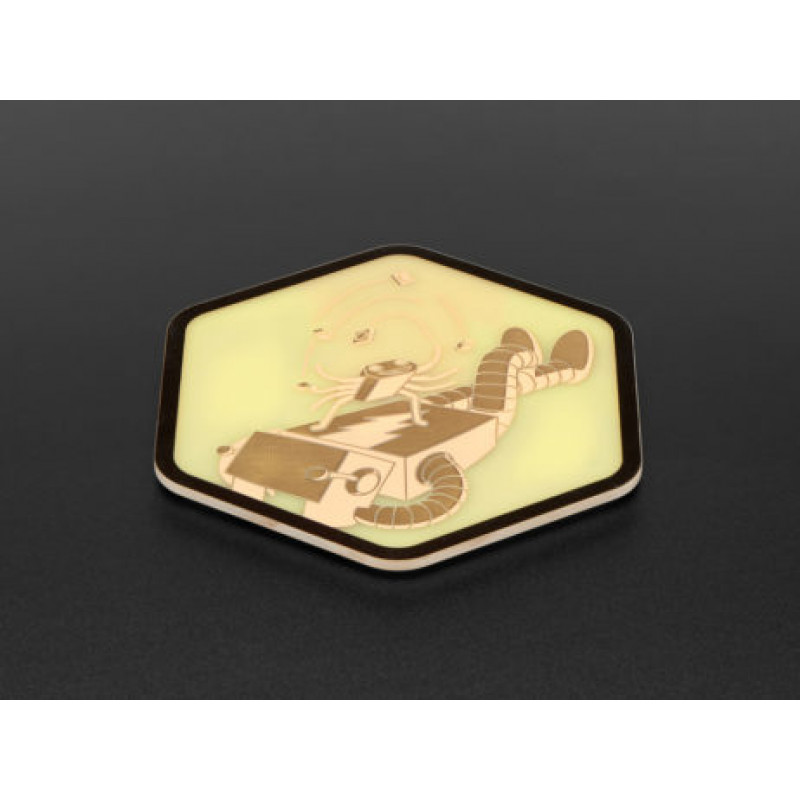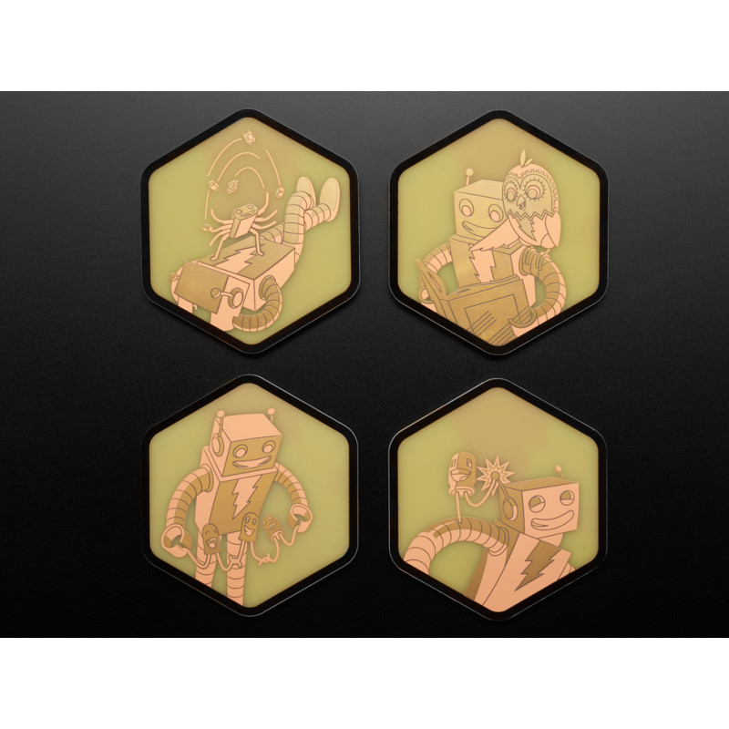 This coaster featuresHans the 555 Timer ICandAdabot on an extra-sturdy 2.4mm thick FR4 PCB bursting with black silk, copper cladding, and golden highlights. To let the natural copper beauty come through, and maintain durability, They specified a clear mask and finished with electroless nickel immersion gold (ENIG), so they look incredibleand last for years. Also packaged are four clear bumpers for a lil extra stability, stick them on the bottom for a good grip.