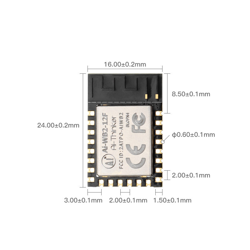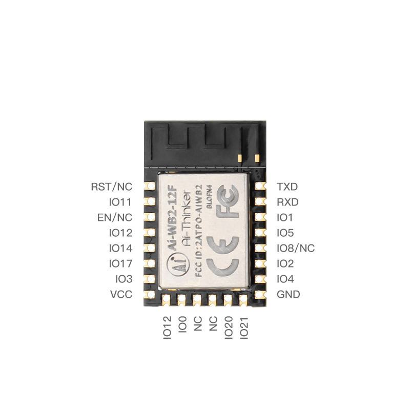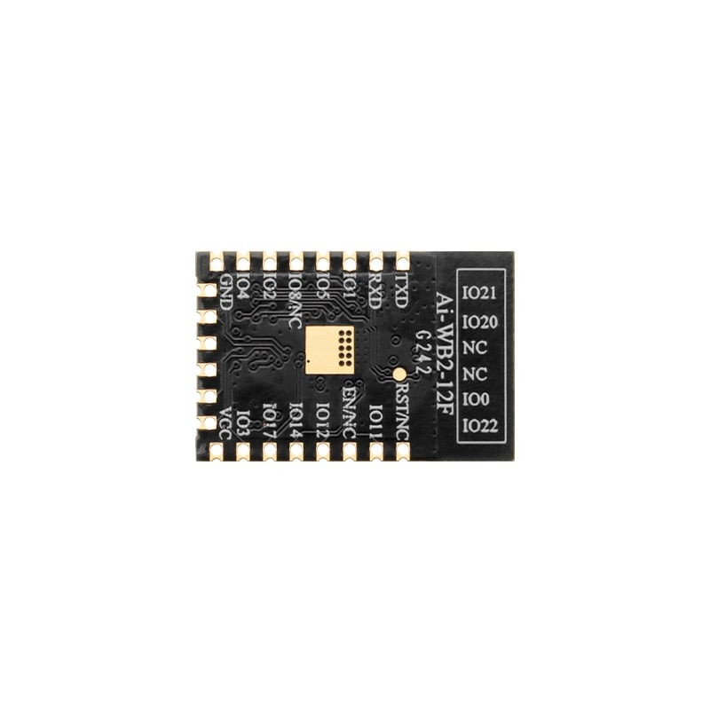 Ai WB2 12F is a Wi-Fi & BT module developed by Ai Thinker Technology Co., LTD. The module is equipped with a BL602 chip as the core processor and supports Wi-Fi 802.11b/ g/n protocol and BLE 5.0 protocol. The BL602 chip has a low power 32 bit RISC CPU, 276KB RAM, and a wealth of peripheral interfaces, including SDIO, SPI, UART, I2C, IR Remote, PWM, ADC, DAC, PIR, and GPIO, etc. It can be widely used in the Internet of Things (IoT), mobile devices, wearable electronic devices, smart homes and other fields.