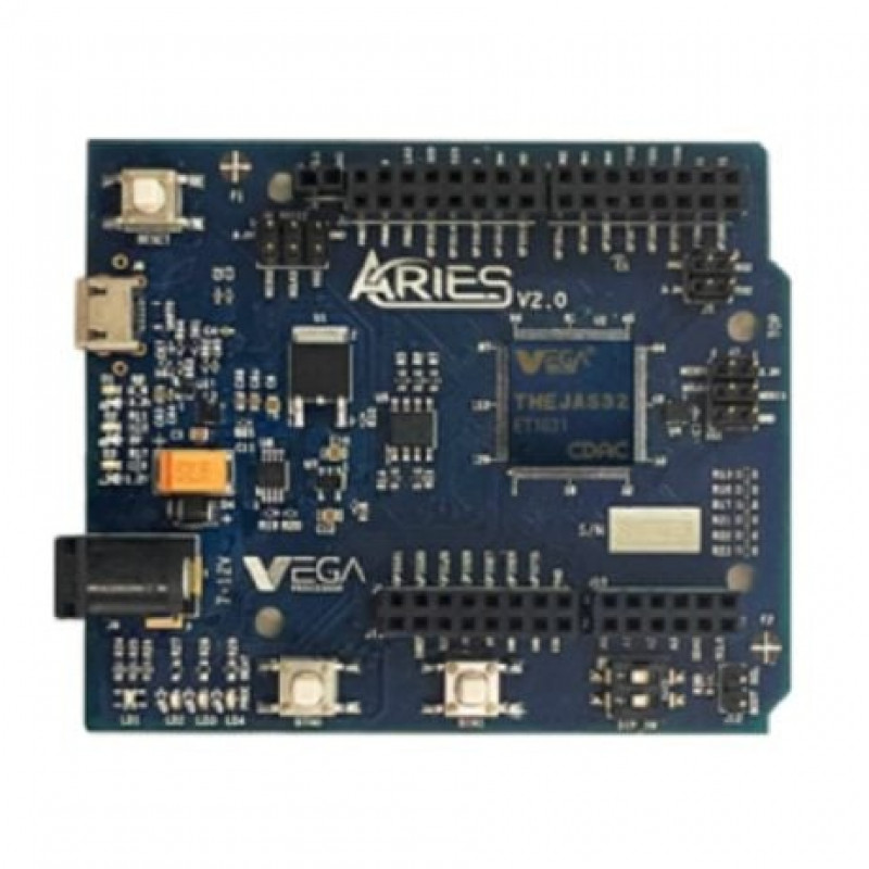 ARIES v2.0 is a development platform based on THEAJS32 ASIC which operates at a frequency of 100MHz. THEJAS32 SoC includes a VEGA ET1031 Microprocessor, 256KB internal SRAM, Three UARTs, Four SPIs, Three TIMERs, Eight PWMs, Three I2C interfaces, 32 GPIOs, etc. This board contains everything needed to support the standalone operation. To get started simply connect the board to a computer with a USB cable or power it with an AC/DC adapter or a battery.