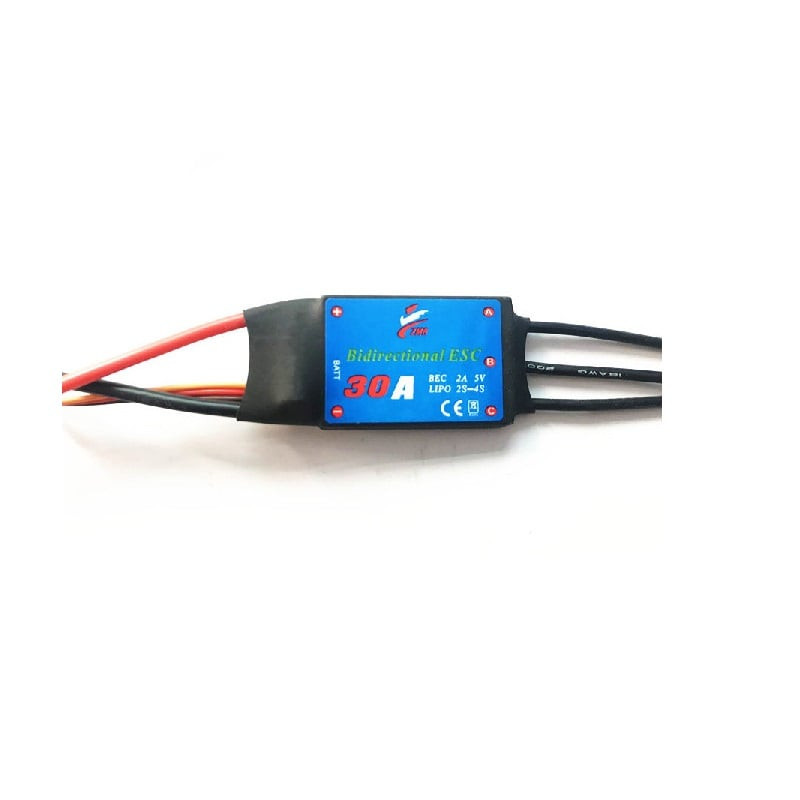 Bidirectional 30A 2-4s UBEC 2A 5V. It can be used in cars, ships, and underwater thrusters.No need to calibrate the throttle stroke, plug, and play.This product adopts imported components, a full power test. bidirectional power output, no brake, direct reverse, quick response, and good handling.