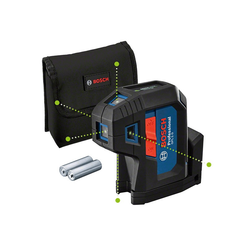 The 5-point laser GPL 5 G Professional stands out with its durable and compact design, making it the ideal choice for laying out 90-degree walls. Its green laser points provide up to four times better visibility than red points. With its rubberized housing and recessed glass, as well as IP65 dust and water jet protection, the GPL 5 G Professional resists tough job site conditions. This 5-point laser is transport-ready in no time, thanks to an integrated rotation mount that features strong magnets for fast and secure tool mounting.