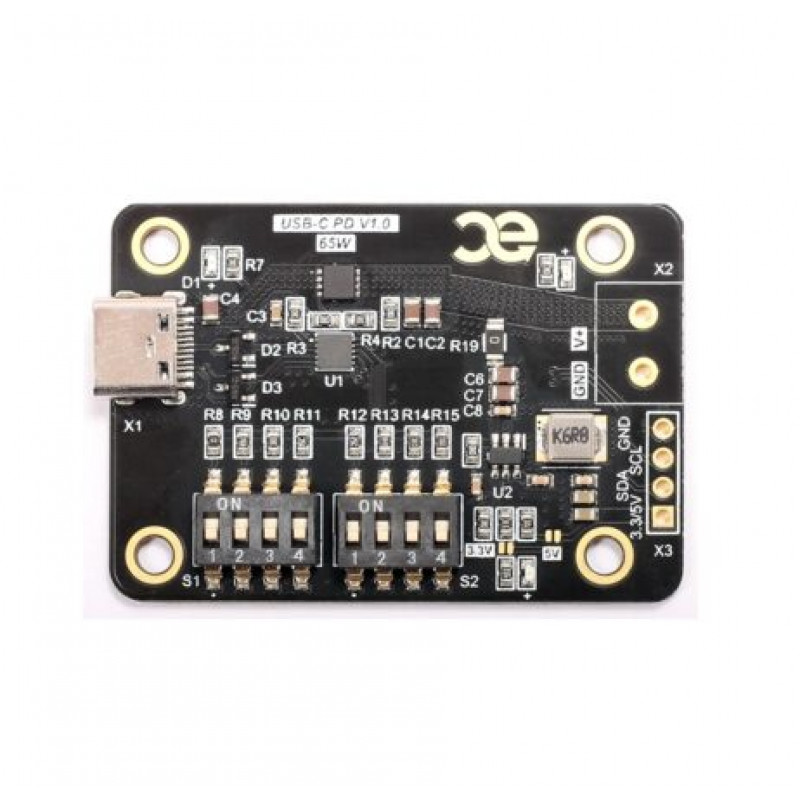 - Power delivery up to 65W via DIP switch and 100W via I2C command (I2C pullups are not on the board). Please note that the 3.25A setting (via DIP Switch) may not work with many USB-C PD chargers. We have also observed this during testing.