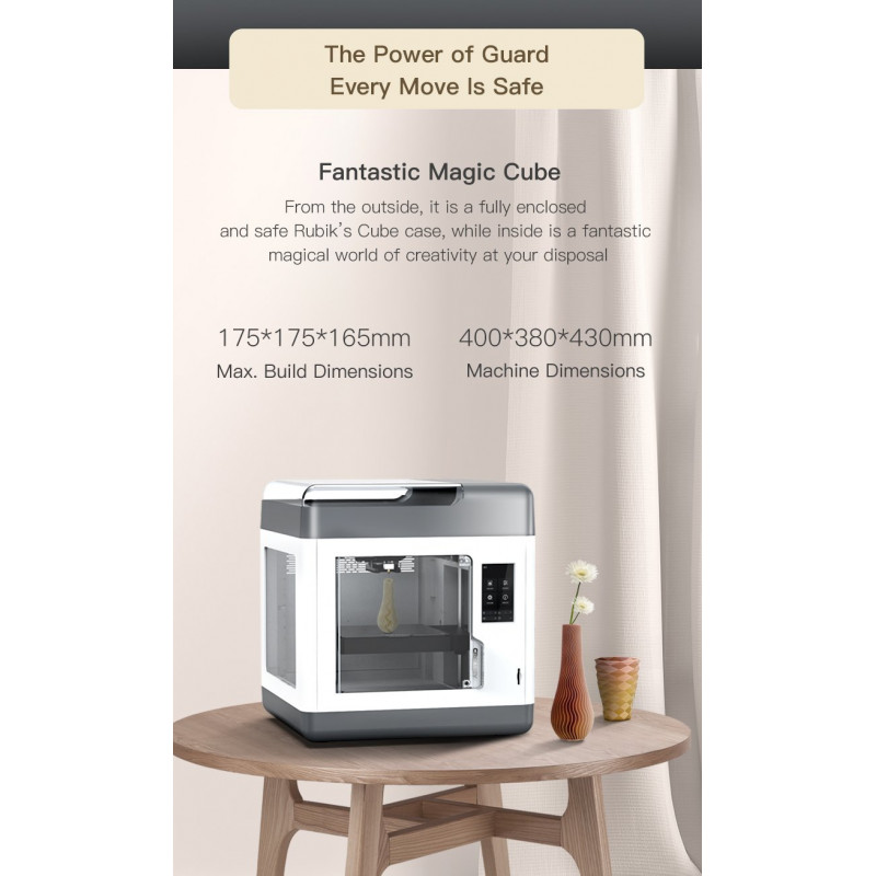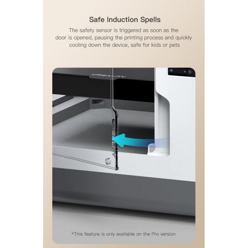 The safety sensor is triggered as soon as the door is opened, pausing the printing process and quickly cooling down the device, safe for kids or pets (*This feature is only available on the Pro version)