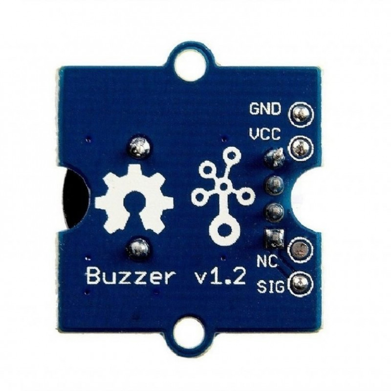 This Grove Buzzer v1.2 module has a piezo buzzer as its main component. The piezo element makes a clicking sound each time when it is pulsed with current. If we pulse it at the right frequency (for example, 440 times per second to make the note middle A), these frequent clicks will run together to produce a little melody.