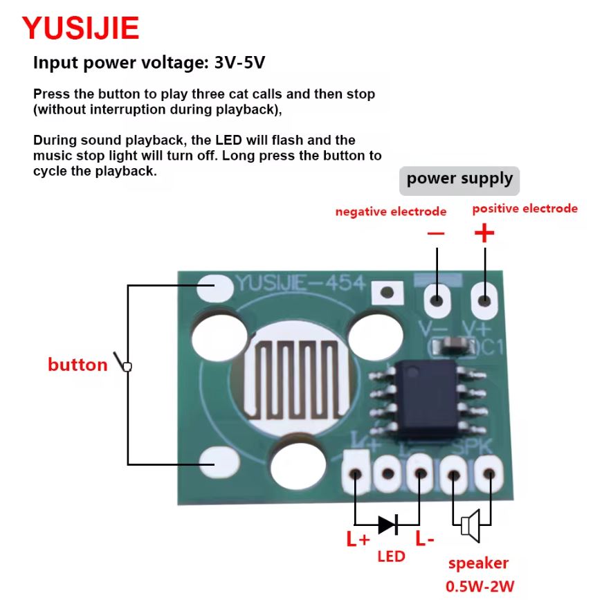 A useful as well as single module to produce dog barking musical sound that can be easily interfaced with speakers and a simple power supply without the need for additional amplifier units. The module has a non-removable chip and easy-to-connect PCB leads for trouble-free soldering solutions.
