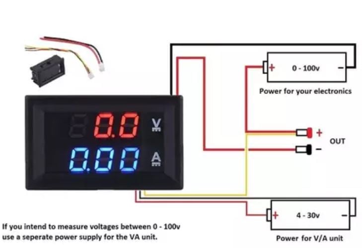 Display Voltage and current simultaneously in different colors, red for Voltage, Blue for current (the current is Measured in the negative rail). 2 Require external power supply; with reversed connection protection. 3 Ground wire of testing end and power supply terminal is the same wire; quick refresh of about 500 MS/time. It has voltage and current calibration potentiometers. Applications: Suitable for automotive/electric cars/motorcycles battery monitoring or other products voltage current measurement.