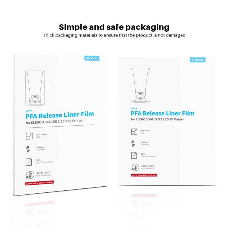 Our high-quality PFA release film is specifically designed for ELEGOO Saturn series resin 3D printers, including Saturn 2 8K, Saturn 8K, Saturn 3, Saturn 4, and Saturn 4 Ultra. Measuring 273*176mm with a thickness of 0.127mm, this release film is made from premium PFA materials, offering excellent wear resistance, chemical resistance, non-stick properties, UV stability, and high-temperature resistance. It provides superior release performance compared to FEP, with a lifespan 50% longer, capable of up to 90,000 releases. The films smooth surface, with no wrinkles, scratches, or bubbles, ensures consistent high-quality prints. Its 95% UV light transmittance guarantees faster and more accurate curing, while the thicker packaging with foam ensures the film arrives in perfect condition, free from damage or warping.