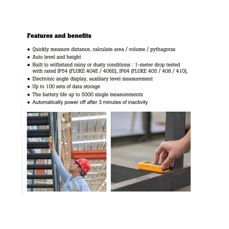 Just point and click to instantly measure up to 40 meters, new Fluke Laser Distance Meters are fast, accurate, durable, and easy to use. These Laser Distance Meters have the Flukes core value you expected. The simple design and easy-to-use button operation allow you to operate with one hand, minimize the time spent in measuring, also maximize the reliability of measurements.