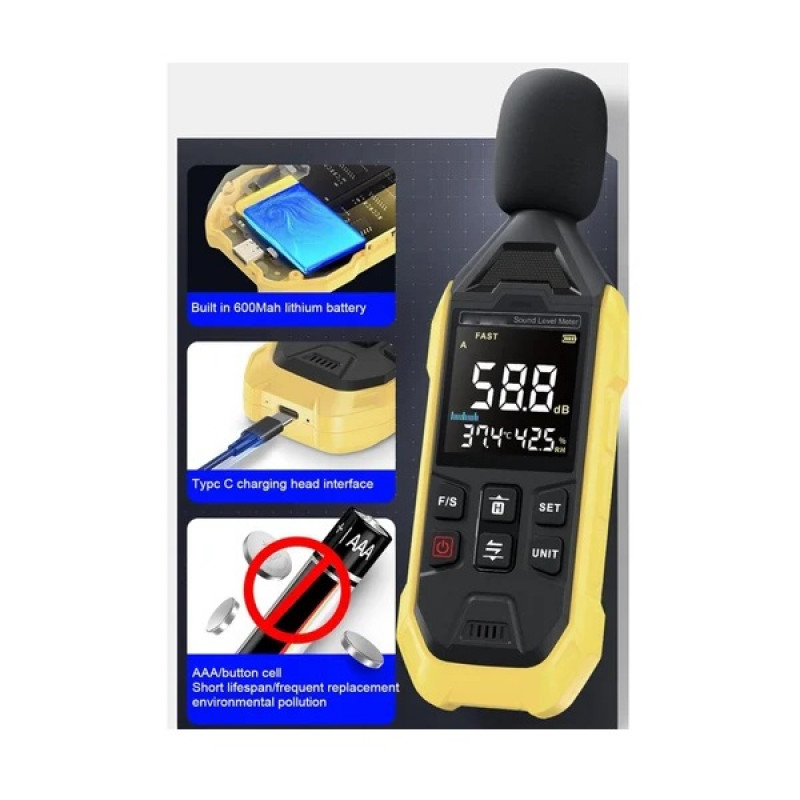 - Digital Display: Features a clear LCD screen for easy reading of sound levels, with backlight for visibility in low-light conditions.