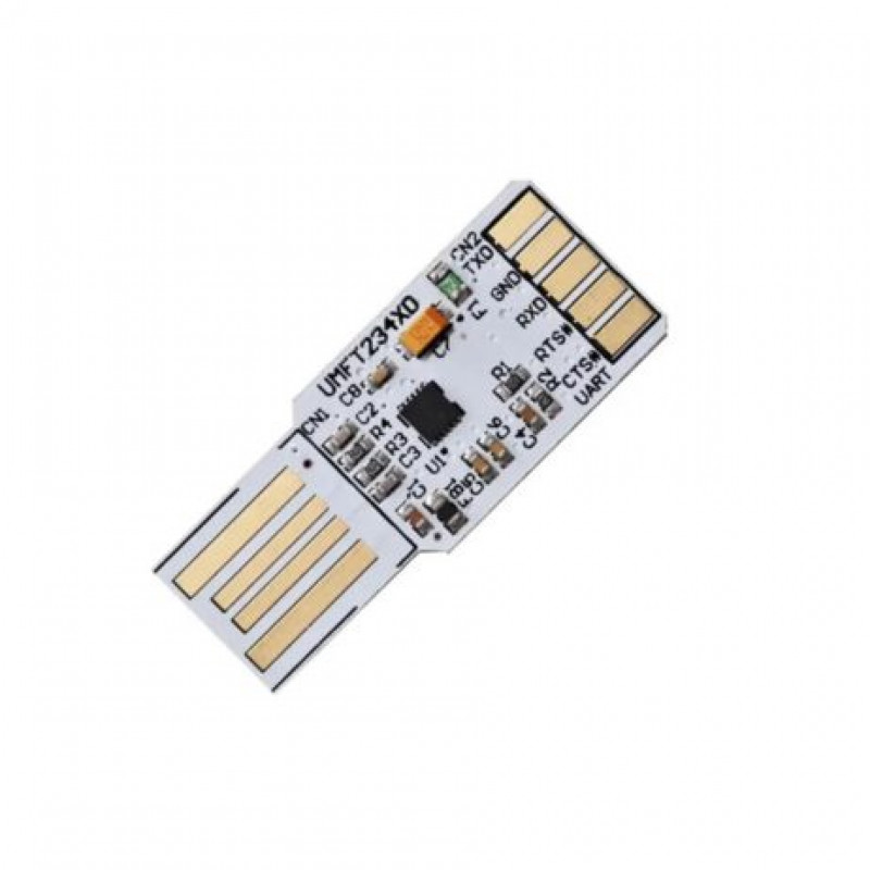 The UMFT234XD is a breakout board that converts USB 2.0 Full-Speed to UART. These modules do not have a USB connector, instead, the modules plug directly into the USB host connector and the pads of the PCB make electrical contact with the electrical contacts of the USB connector. The UART interface operates at +3.3V voltage levels, however, all I/Os are 5V tolerant USB to UART with four control bus lines, 3.3V power out limited to 50mA and 5V with as safety fuse. UART signals are available via 8 pads on the PCB.