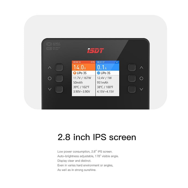 - ISDT Charger Various Battery Type Compatibility: All-in-one control for LiFe, Lilon, LiPo 1~6S, LiHv 1-6S, Pb 1-12S, NiMH/Cd 1-16S batteries, automatic battery type identification with intelligent charge algorithm matching to complete charging and discharging work.