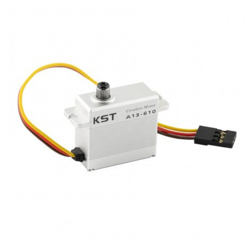A13-610 is a medium to high voltage range metal cased servo with excellent speed and torque specifications. The KST A13-610 has a hardened steel drive train and a coreless motor capable of running all the way from 4.8V to 8.4V (4S NiMH to 2S LiPo) making these servos ideal for electric powered models (most ESCs output 5.5V) as well as most gliders.