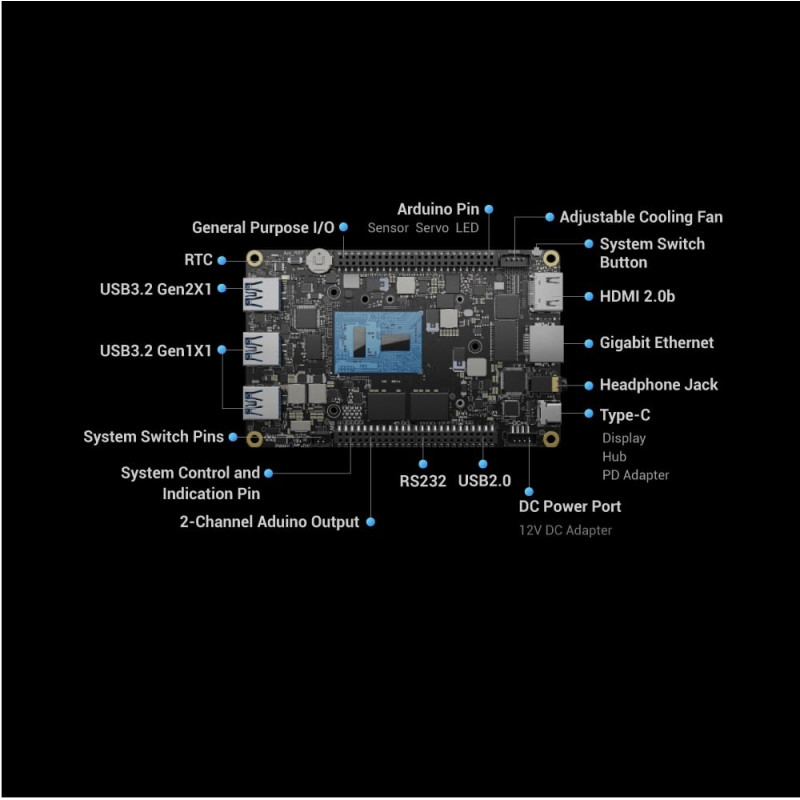 - GPIO & Other Features: 12x Analog Inputs, Up to 23x Digital Input/Output (7 PWM), 1x UART, 1x I2C, 1x SPI, 1x Audio Connector, 1x 4-Pin RS232 Header, 1x Fan Port (4 Pin 1.25mm PWM 5v), 1x 4-Pin Header (Power and Switch).