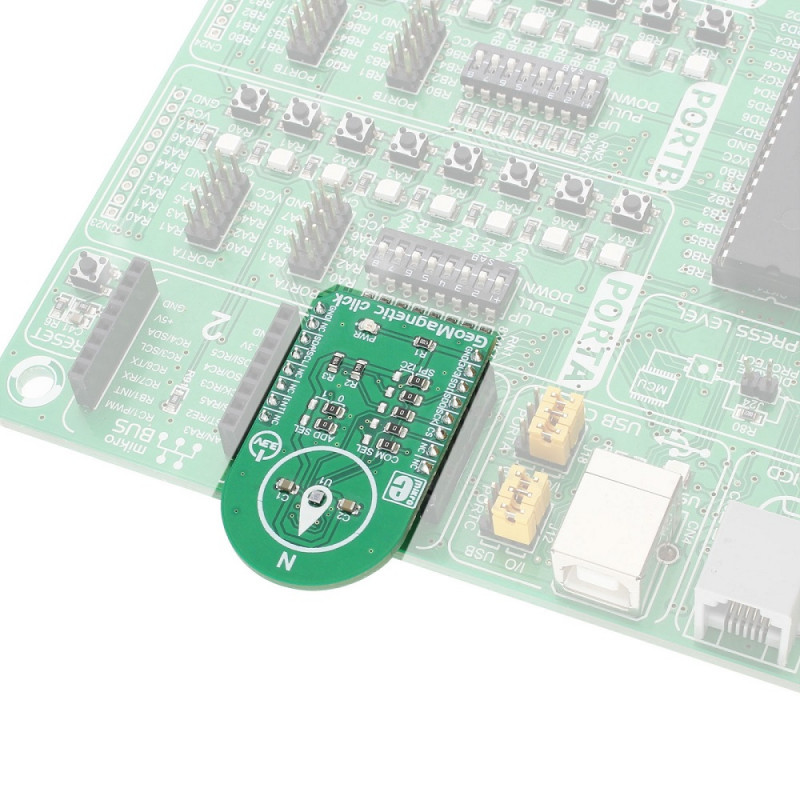 GeoMagnetic click carries theBMM150, a three-axis geomagnetic sensor fromBosh Sensortec. Featuring the proprietary FlipCore technology from Bosch, low power consumption, and noise, as well as thermally compensated measurements, this device is specially tuned and tailored to be used in demanding 3-axis mobile applications.