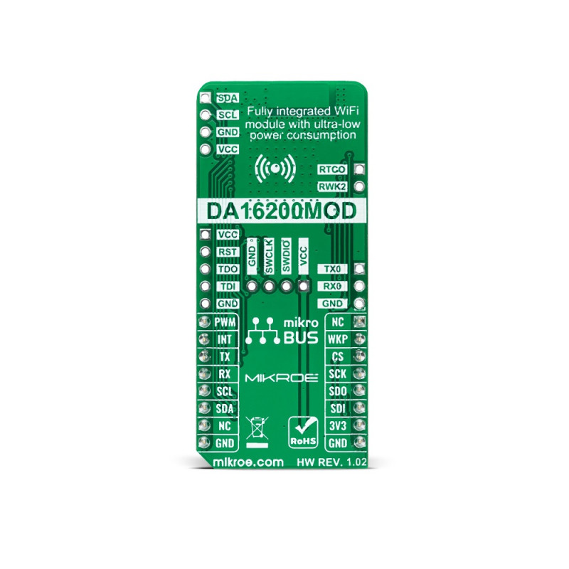 - On-board modules: DA16200MOD-AAC4WA32 highly integrated ultra-low power Wi-Fi module from Dialog Semiconductor