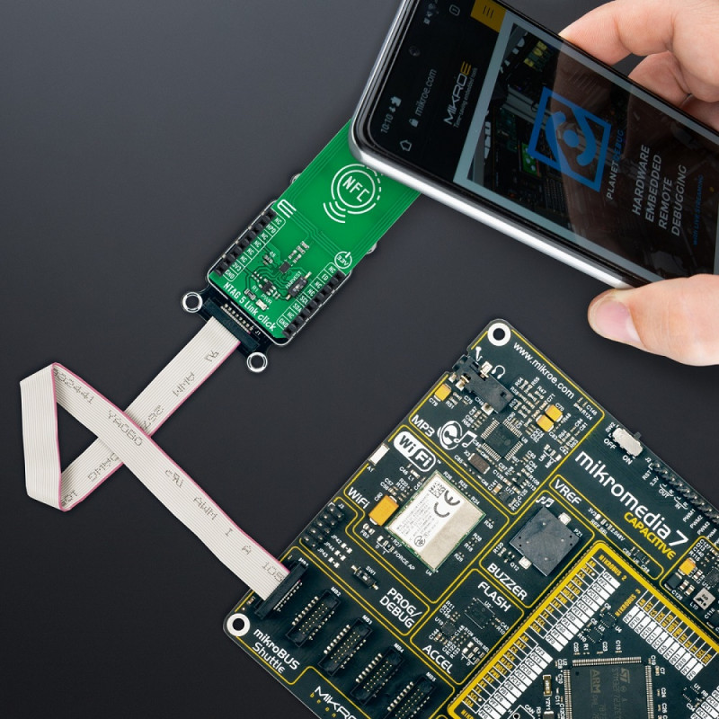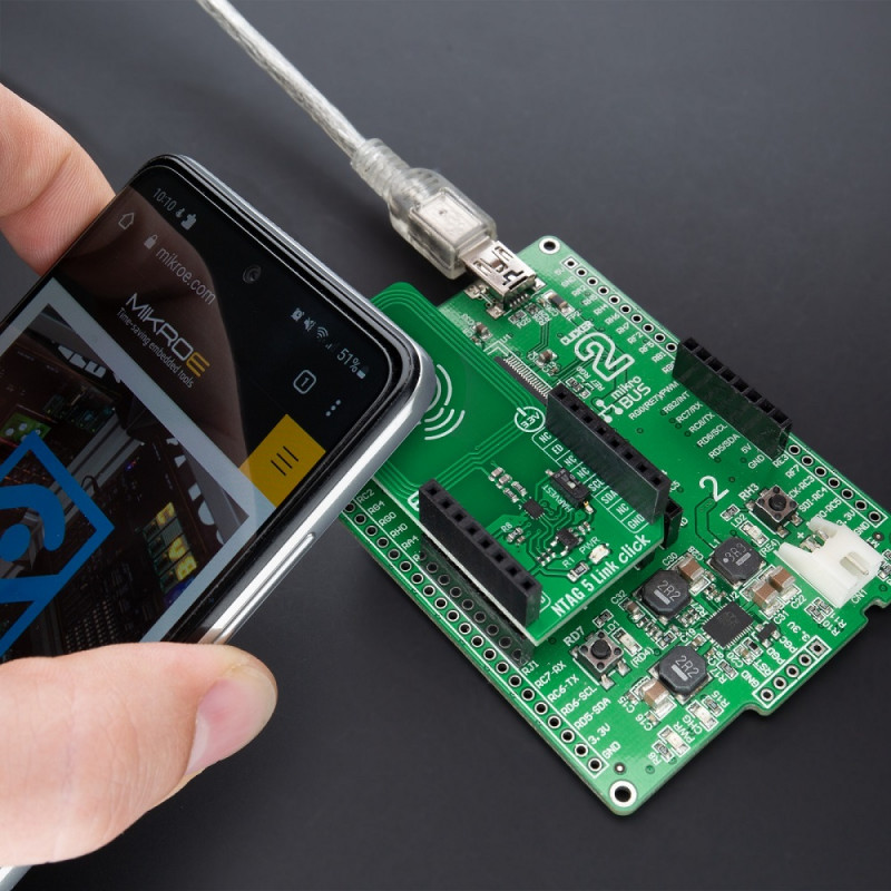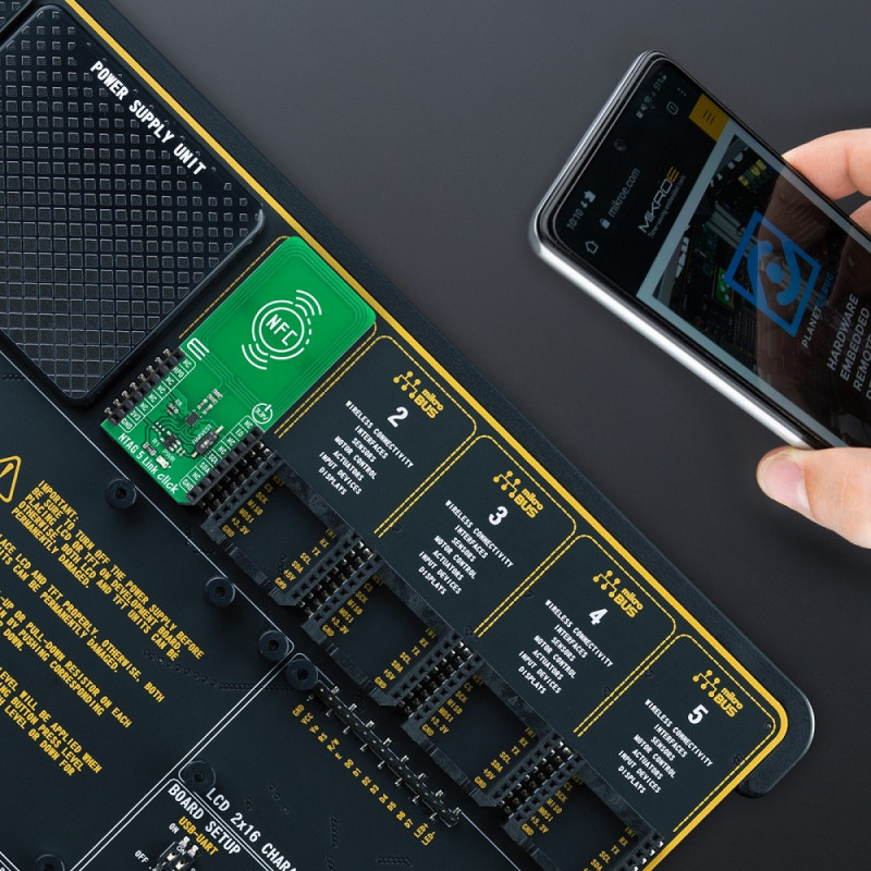 NTAG 5 Link Click is supported by a mikroSDK compliant library, which includes functions that simplify software development. This Click board comes as a fully tested product, ready to be used on a system equipped with the mikroBUS socket.