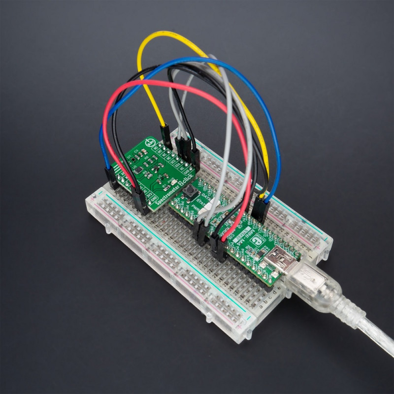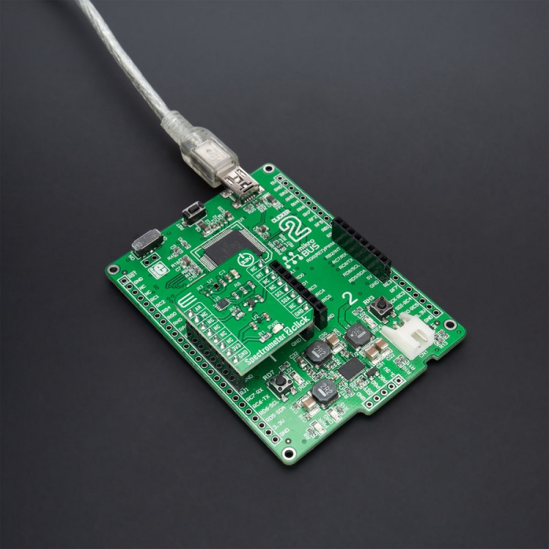 Spectrometer 2 Click as its foundation uses the VD6283TX, a color sensor with advanced light flicker extraction from STMicroelectronics. It performs fast and accurate light measurements thanks to an individual ADC with a resolution of 24 bits (16 bit + 8 bit for high accuracy under low light) and a readout for six color channels: red, green, blue, IR, clear, and visible. The color channels can be individually enabled to optimize power consumption, alongside 15 programmable gains for a high-dynamic range, through a serial interface. Six channels can operate with independent, parallel reading for ALS or flicker operations, one represents a dedicated fast channel for light flicker measurement, and one stands for an internal dark channel.