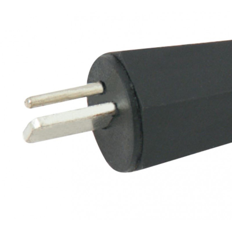 - The male version has a central flat pin, and circular pin mounted off-centre.