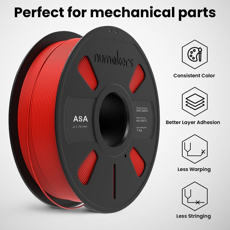Numakers ASA 3D printing filaments are made of high-purity Acrylonitrile Styrene Acrylate pellets. They are the perfect choice for achieving technical-looking prints with exceptional durability and chemical, temperature & UV resistance. It is ideal for projects exposed to sunlight and the elements, relied upon by industries like automotive, marine, and RV.ASA is easy to print, offering enhanced durability and a sleek finish compared to ABS.