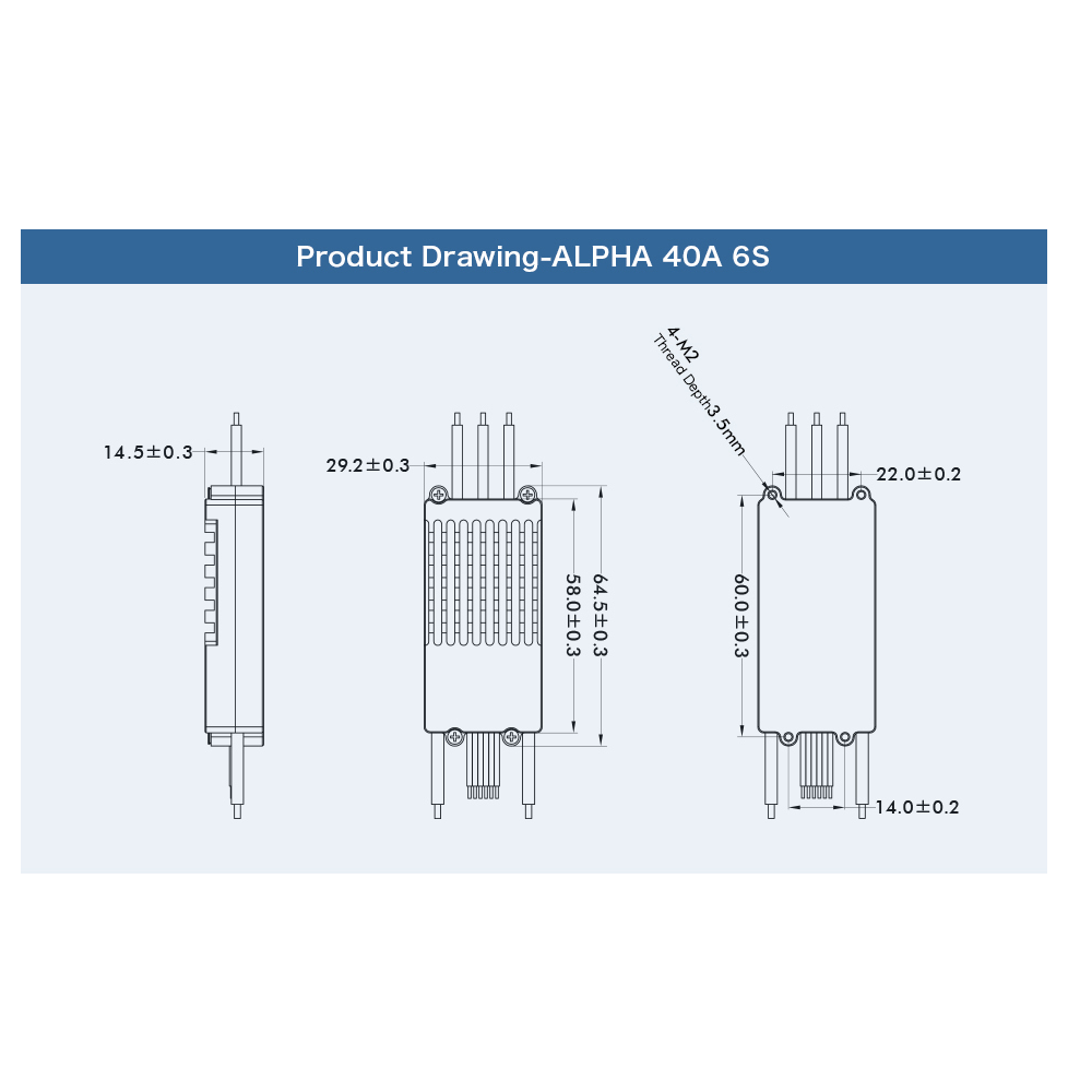Low noise ALPHA 40A 6S T-motor ESC Featured with low voltage, fast response and linear throttle, Low interference and high efficiency. ALPHA ESC has faster responses with less pulse current and steady startup as compared with traditional square wave driving. This Tiger motor ESC contains over current/Motor Lock-up/short circuit/Low voltage protection. Its Intelligent design enables ALPHA ESC to timely detect parameters as to voltage, current and temperature.