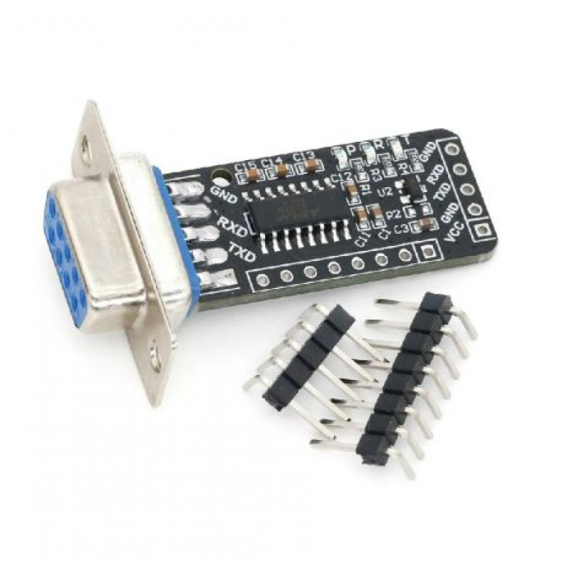 This RS232 to TTL Serial Interface Module is a board with the MAX3232 transceiver integrated circuit (IC). It facilitates serial communication between TTL and RS232 ports by providing the necessary electrical signal conversion. These boards usually have a DB9 connector soldered at one end and four header pins with jumper cables at the other end. The jumper cables enable the user to connect the wires to a breadboard or a microcontroller project board, whilst the DB9 connects directly to a COM port of a computer.