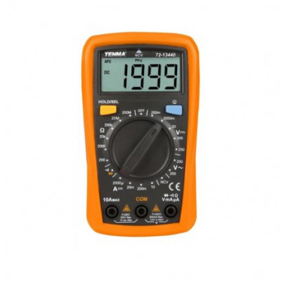 TENMA 72-13440Handheld Digital Multimeter DC Current, AC/DC Voltage, Continuity, Diode, Resistance, 3.5, 1999 These models ensures that users can work safely in CAT II 250V environment. Features: Clear LCD Display Equipped with Comfortable Protective Cover, Test Probe Holder 2 Meters Drop Test, Precision Protection Auto Power Off Auto Backlight Off Loud Buzzer Sound Knobs Shift Smoothly, In-line with Ergonomics DMM Functions: DC Current, AC/DC Voltage, Continuity, Diode, Resistance No. of Digits: 3.5 DMM Response Type: Display Count: 1999 Range Selection: Manual Voltage Measure DC Max: 250V Voltage Measure AC Max: 250V Current Measure DC Max: 10A Current Measure AC Max: Resistance Measure Max: 0.2Gohm
