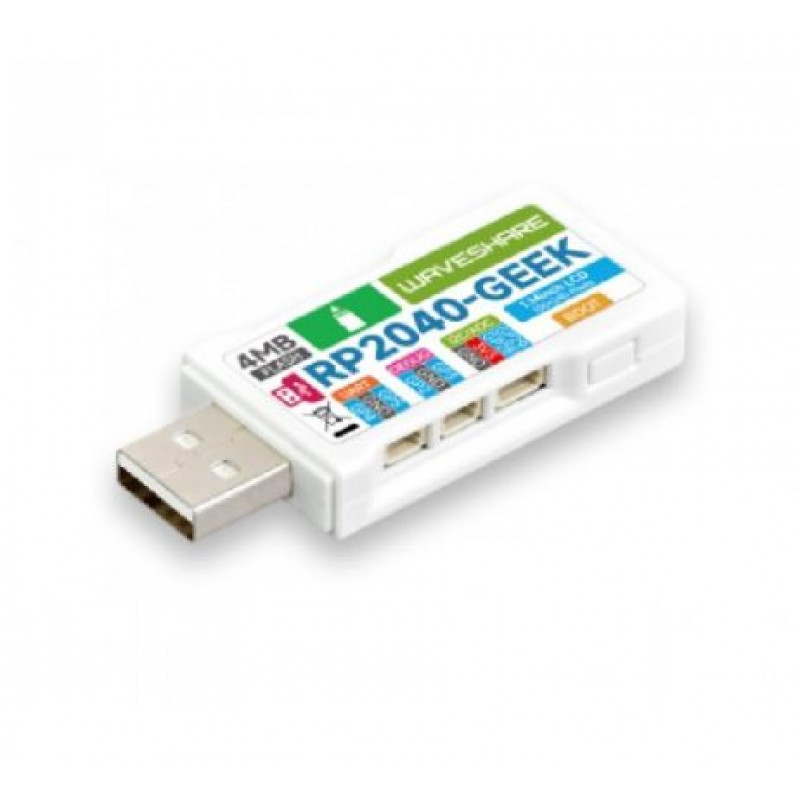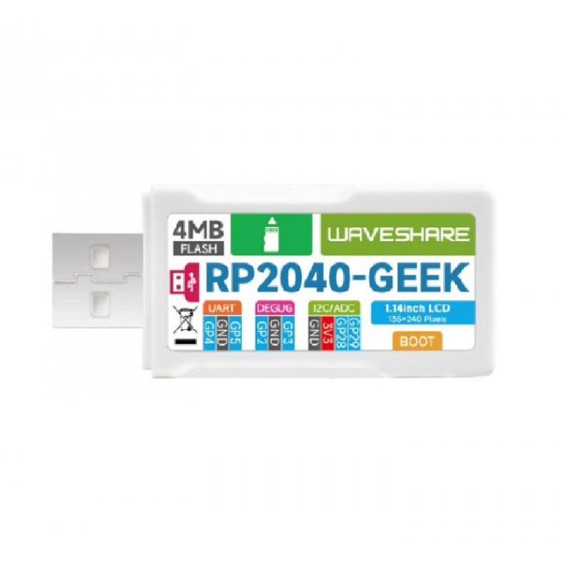 RP2040-GEEK is a geeks development board designed by Waveshare, onboard USB-A interface, 1.14-inch LCD screen, TF card slot, and other peripherals. Provides different firmware for SWD port, UART port, and I2C port.