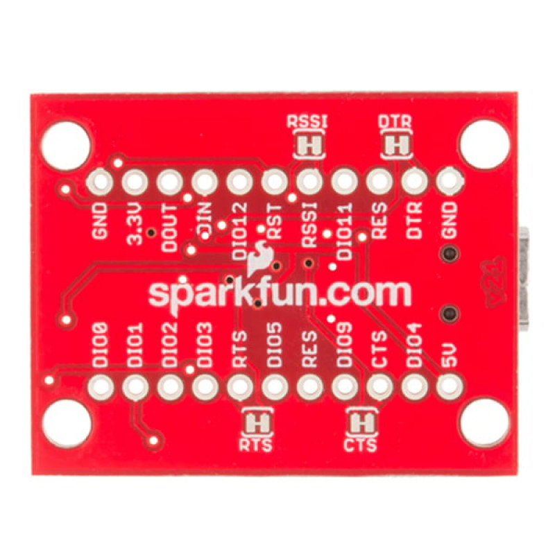 Theres also a reset button, and a voltage regulator to supply the X Bee with plenty of power. In addition, there are four LEDs thatll help if you ever need to debug your X Bee: RX, TX, RSSI (signal-strength indicator), and power indicator. This board also breaks out each of the X Bees I/O pins to a pair of breadboard-compatible headers. So if you want to make use of the X Bees extended functionality, you can solder some header pins into those, or even just solder some wire.