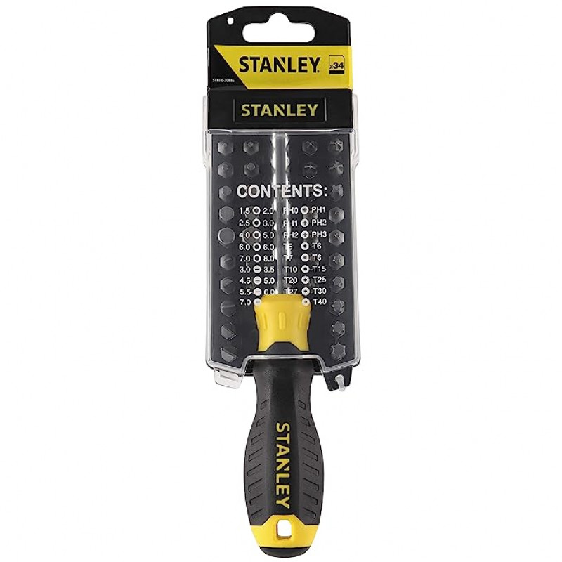 The Stanley piece Screwdriver Set includes all the popular screwdriver sizes and has a compact design and a rubber molded handle for extra comfort. The unique case holds bits in place that would otherwise be lost, providing a secure storage solution. Magnetic bit holder allows for a quick and secure changeover.