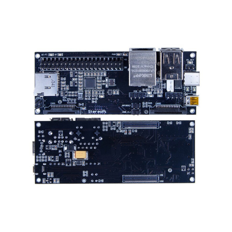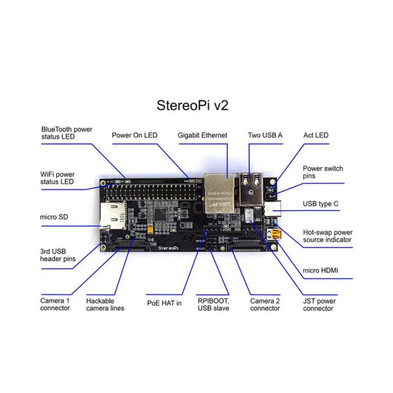 The StereoPi v2 Slim is an open-source stereoscopic camera carrier board for the Raspberry Pi Compute Module 4, enabling real-time capture, processing, and livestreaming of stereoscopic video and images. With applications in robotics, AR/VR, and more, it supports various camera modules, micro HDMI output, and multiple connectivity options. Measuring 100mm x 40mm x 23mm (standard) or 15mm (slim), it offers compatibility with Raspberry Pi OS and versatile power input options.