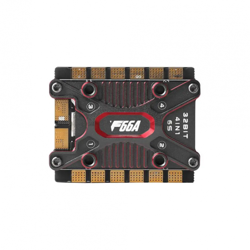 TheT-Motor F66A Mini 66A 3-6S BLHeli_32 4-In-1 ESC 2020features double-sided heatsinks design for higher peak current, a high-quality TDK Capacitator for strong power filtering and offset mounting holes that have been moved forward for easy installation on racing drones.