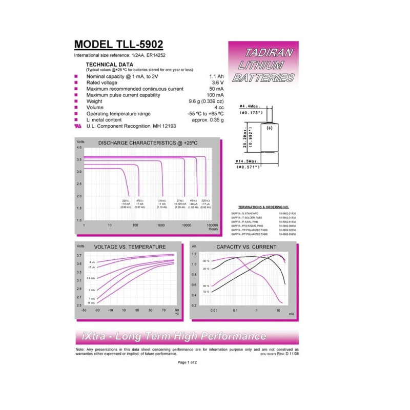 Tadiran TL-5902 is an improved iXtra series Lithium Thionyl Chloride (Li/SOCl2) cell made for long term high performance and extreme temperatures. Tadiran has the most powerful and reliable lithium primary cells in the world to supply power for todays increasingly sophisticated and complex technologies.