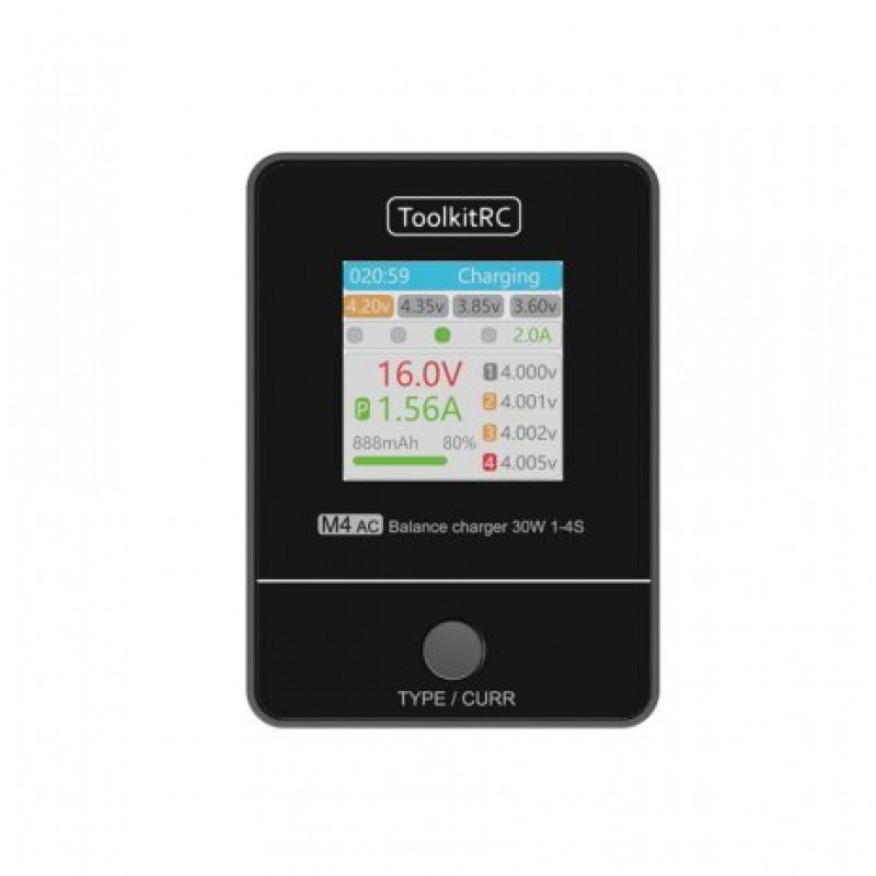 Introducing the ToolKitRC M4AC 30W 2.5A Compact AC Balance Charger small in size, massive in breakthroughs. With a 33%-66% power performance boost compared to its peers, this charger elevates your charging experience. Featuring a 32Bit ARM Processor for smart precision and an IPS full viewing angle display, it provides real-time voltage, current, and charging status. Compatible with XT30 and XT60 interfaces, it suits most batteries. Compact and versatile, the M4AC is your ideal global travel companion with a wide 100-240V voltage range. Small size, big performance. Charge smarter with ToolkitRC.