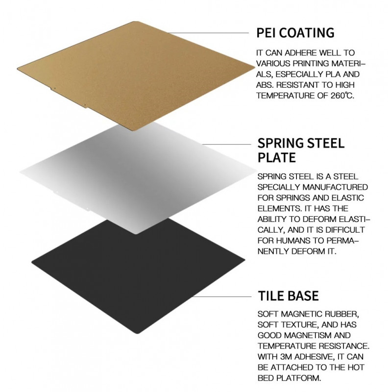 This is Two Trees Double Sided PEI (Textured+PEI) with Magnetic Base Size 310x310mm For 3D Printer. This hotbed has a PEI coating on both sides. PEI (Polyetherimide) is known for its excellent adhesion properties when heated. Having a double-sided coating allows you to use both sides of the bed, providing flexibility in your 3D printing projects.