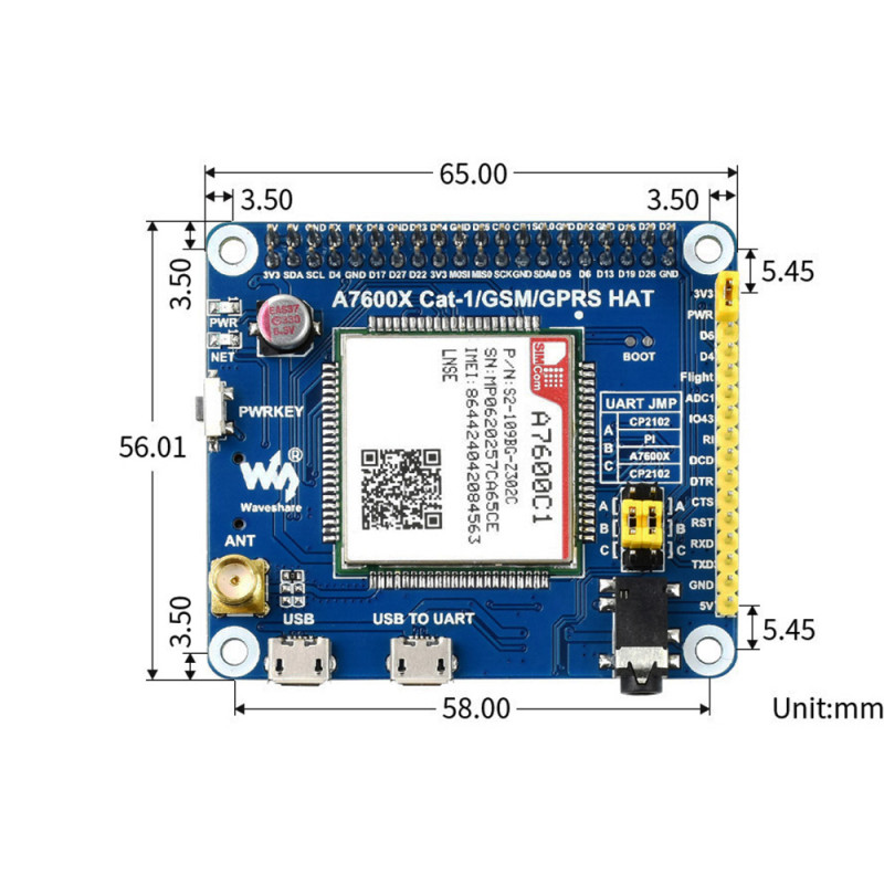 - Breakout common used control pins of the A7600X module, make it easy to connect with hosts boards like Arduino/STM32.