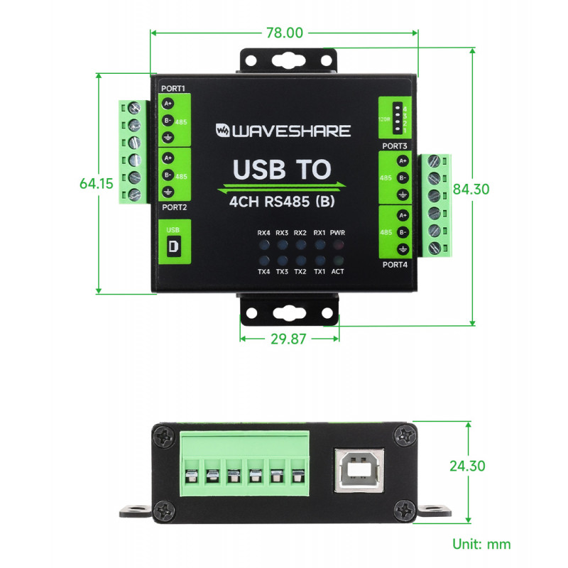 USB TO 4CH RS485 (B) is an industrial USB to RS485 converter, adopting original CH344L, with protection circuits such as built-in power isolation, ADI magnetical isolation, and TVS, aluminum alloy case design. USB TO 4CH RS485 (B) is easy to operate, automatic transmit, featuring fast communication, stability, reliability, and safety, suitable for industrial devices and applications with high requirements.