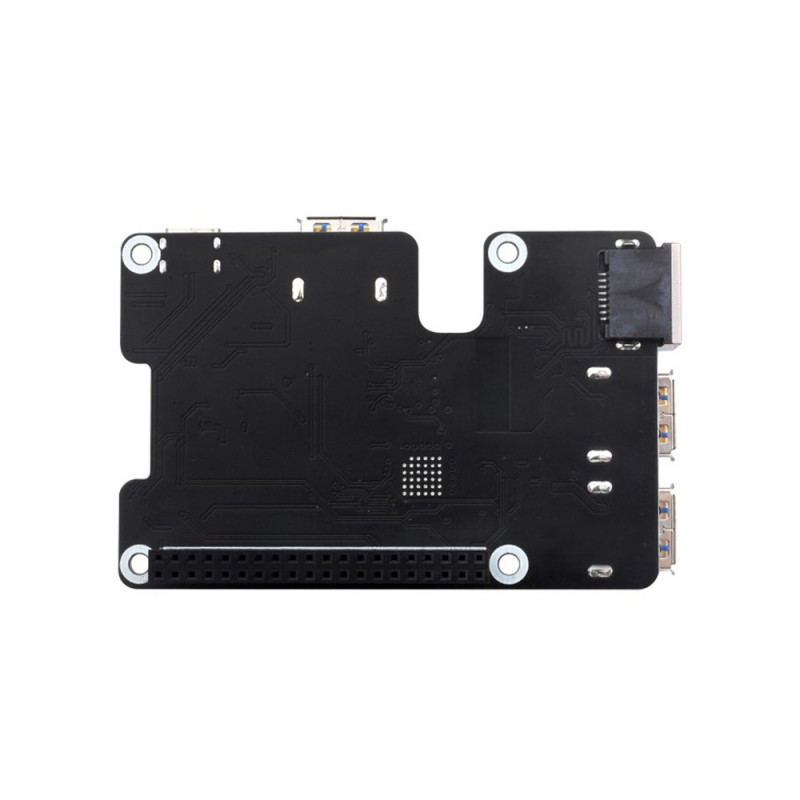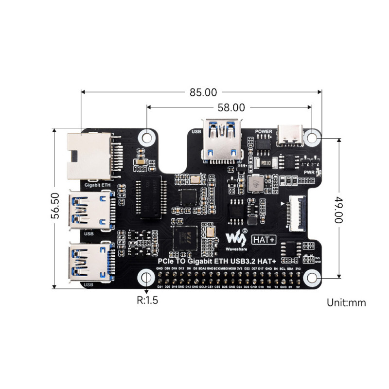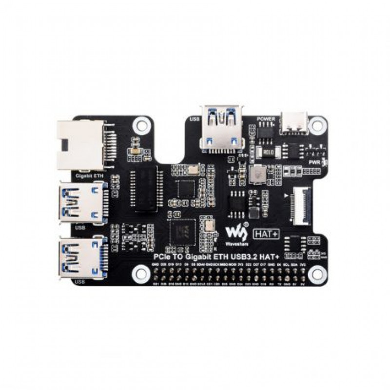 PCIe TO Gigabit ETH and USB 3.2 Gen1 for Raspberry Pi 5, onboard 3 x USB connectors, driver-free, plug-and-play, 3 x high-speed USB ports, Gigabit ETH port, HAT+ standard.