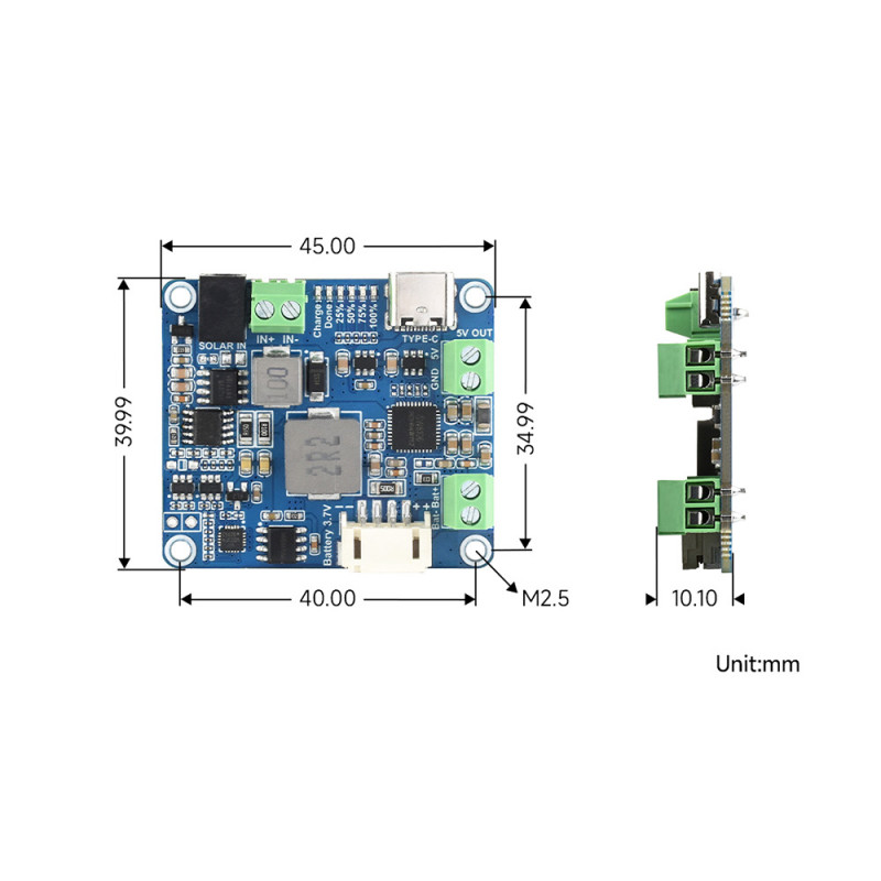 TheSolar Power Management Module (D)is designed for 6V~24V solar panel, it can charge the 3.7V rechargeable Li battery through solar panel or Type-C connector, and provides 5V/3A regulated output (supports multiple protocols such as PD/QC/FCP/PE/SFCP). The module features MPPT (Maximum Power Point Tracking) function and multi protection circuits, therefore, it is able to keep working with high-efficiency, stability, and safety. It is suited for solar-powered, low-power IoT, and other environmental protection projects.