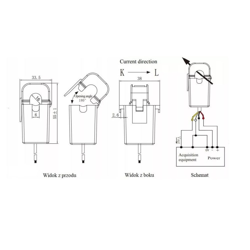 The HST016L current transducer can be used to measure direct, alternating, and pulsating currents. It was designed on the principleof an open loop and there is galvanic isolation between the primary conductor and the secondary circuit.Thanks to its design the openable core is ideal for installation on a cable without breaking the primary circuit.The hole diameter is 16 mm.The output of the transducer reflects the real wave of the conductor.The advantage of this sensor is its low power consumption, which is particularly advantageous when measuring high currents.The length of the cables exiting the transformer is 50 cm (red, black, green, white).